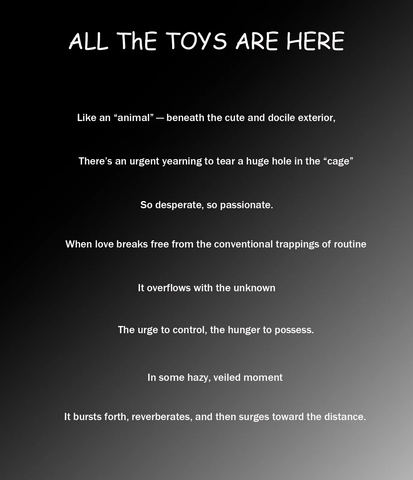? Como um “animal”, sob o exterior fofo e dócil, há um desejo urgente de rasgar um enorme buraco na “gaiola”, tão desesperado, tão apaixonado.? Quando o amor se libertar dos trepeios convencionais da rotina, ele transborda com o desconhecido, a vontade de controlar, a fome de possuir.?? Em algum momento nebuloso e velho, ele exploda, reverbera e depois surge em direção à distância.